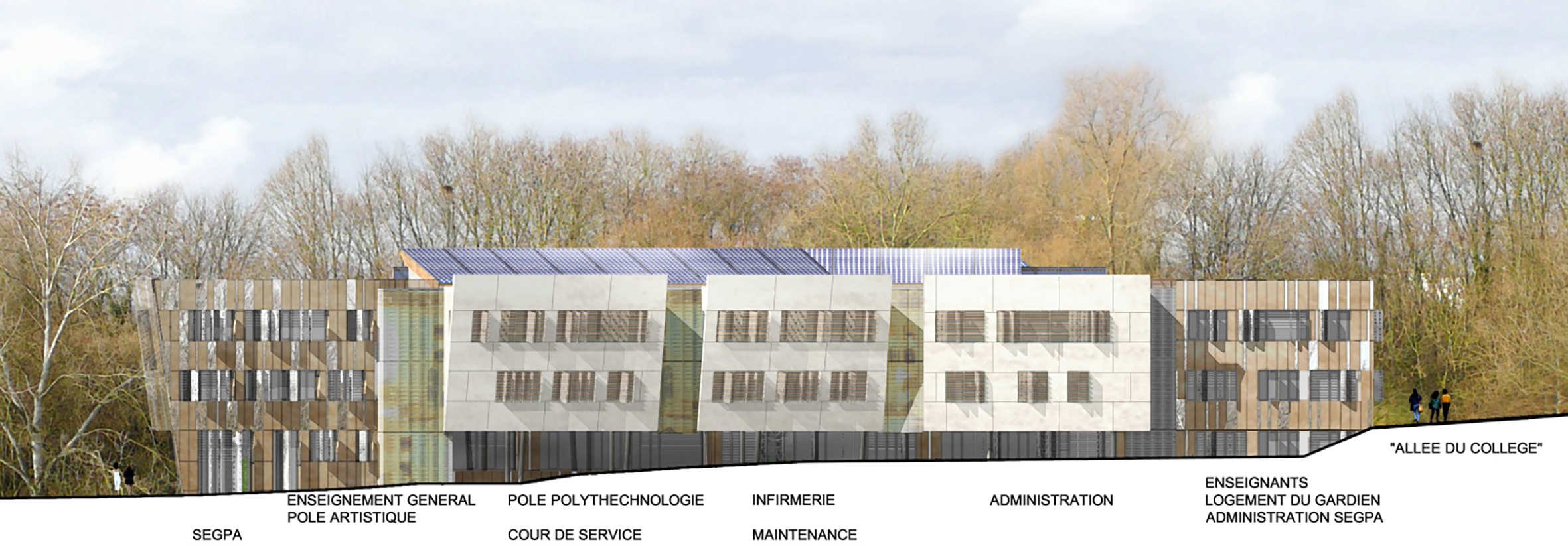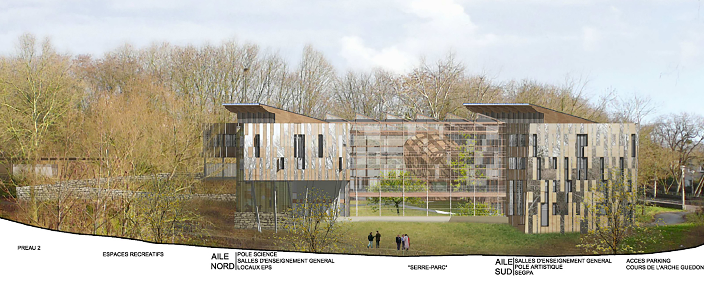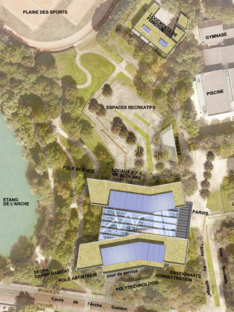 Le projet s’implante parallèlement au sens de la pente, d’Est en Ouest, en offrant ses principales façades au Nord et au Sud afin d’utiliser au maximum le potentiel HQE de ces orientations. Les deux ailes de l’établissement s’ouvrent pour insérer une serre paysagère, véritable prolongement du parc dans le bâtiment d’enseignement. Ce vaste espace paysager matérialise la pente du site et accompagne l’insertion du projet dans le terrain. Le collège ainsi composé fait corps avec la végétation du parc de Maubuée. Depuis les deux ailes du collège, les ouvertures des salles d’enseignement dérouleront une vue panoramique des étangs, de la forêt qui s’étend jusqu’à la Marne et jusqu’à l’axe de l’avenue de l’Arche Guédon avec le château d’eau, repère du quartier. L’implantation du nouveau collège, très compact, permet de minimiser l’impact de la construction sur les espaces boisés et d’en restituer un maximum au parc.